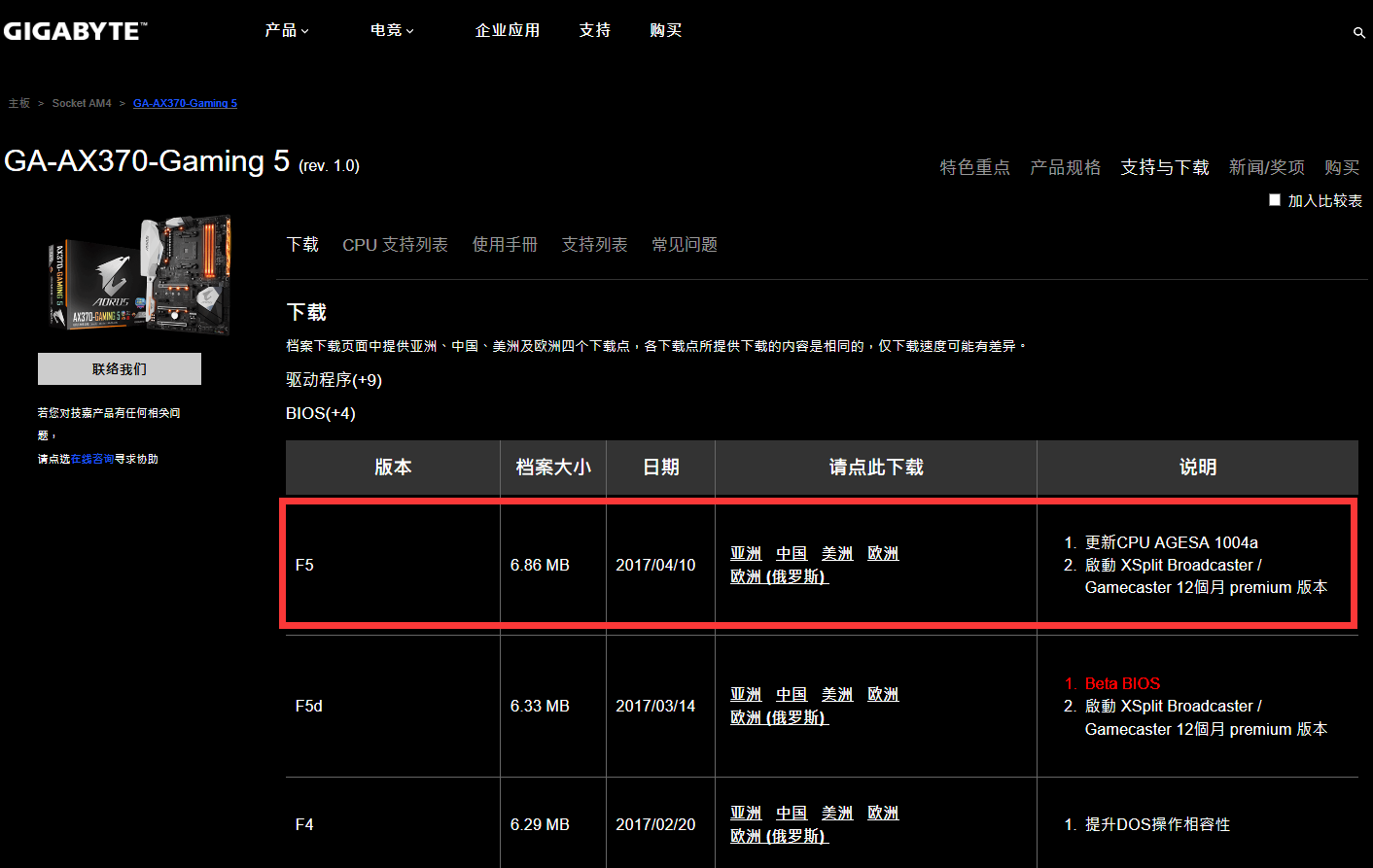 技嘉AX370-Gaming 5最新BIOS下载链接:http://www.gigabyte.cn/Motherboard/GA-AX370-Gaming-5-rev-10#kf