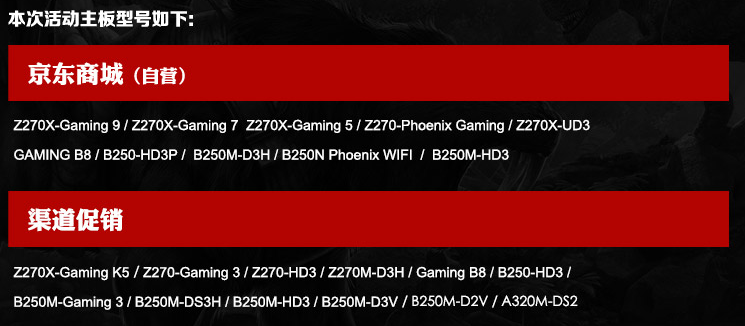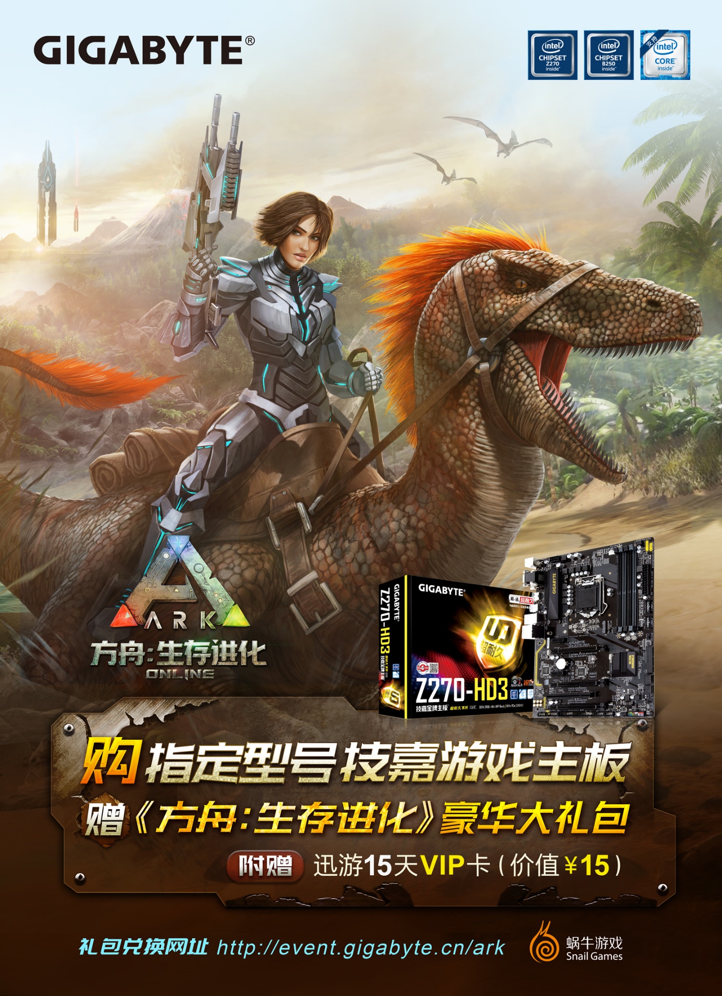 技嘉科技和蜗牛游戏是长期以来的战略合作伙伴。在经过数届ChinaJoy游戏展会以及《九阴真经》、《九阳神功》等游戏的合作,双方已然默契十足。此次技嘉科技和蜗牛游戏再度强强联手,为蜗牛旗下游戏大作《方舟:生存进化Online》量身定制游戏主板,并在全国范围内开展联合促销,即日起在电商及全国卖场购买活动主板,便可兑换价值300元的《方舟:生存进化Online》豪华大礼包一份和价值15元迅游VIP 15天卡一张。