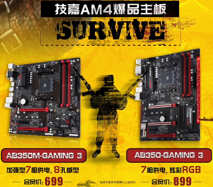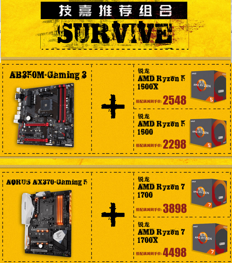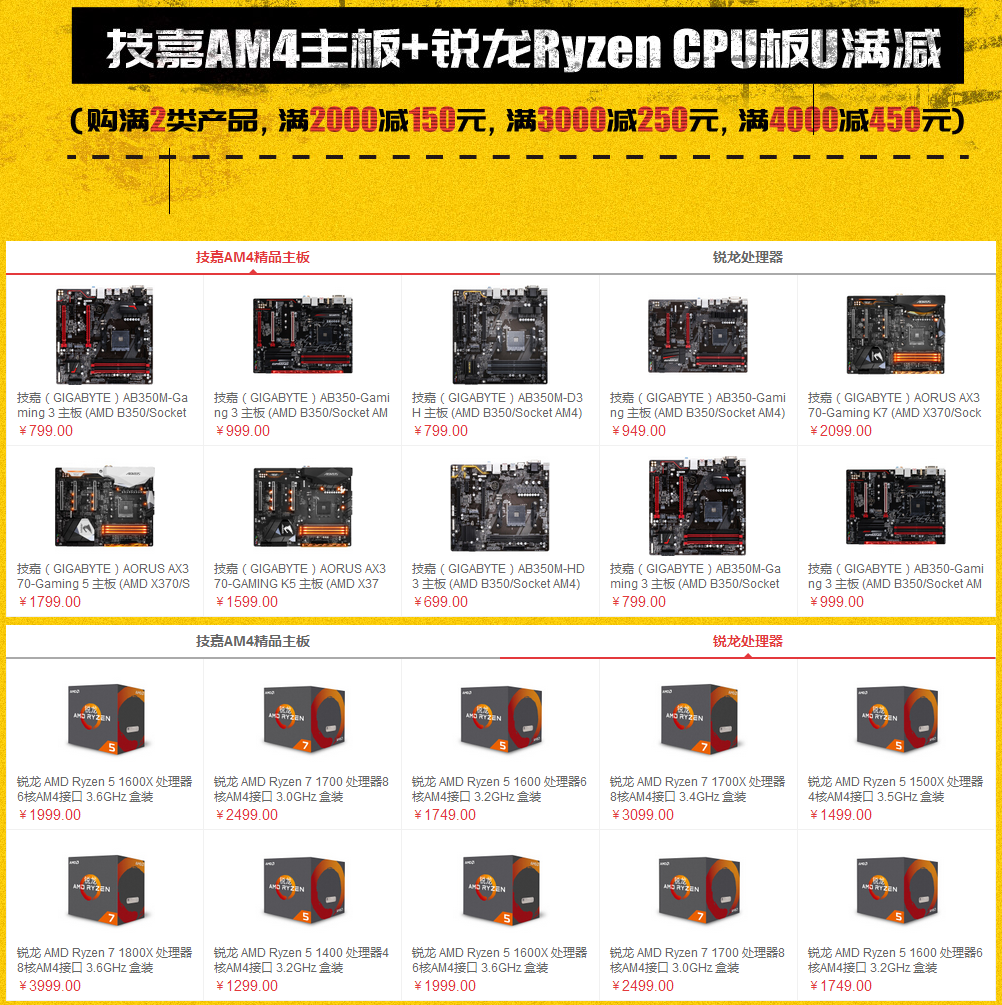 技嘉AB350M-Gaming 3作为一款售价不足700的全新AM4主板,采用Micro ATX板型设计,同样能完美支持锐龙AMD Ryzen处理器。主板选用红黑经典配色,7相供电保证,采用技嘉超耐久品质设计。板载高速M.2 SSD插槽和USB 3.1高速接口,配备可轻松调节的LED呼吸灯光系统,在显卡和内存插槽部分还采用了合金装甲设计,拥有极高的性价比和游戏属性,可搭配锐龙AMD Ryzen5 1600组建超高性价比游戏平台。此外,还有更多AM4主板和锐龙CPU参与活动,玩家可以根据自己的性能需求和预算来选择。