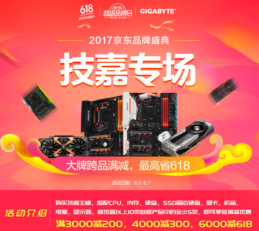全民年中购物节福利提前上演!6月5日至6月7日, 2017京东品牌盛典技嘉专场“大牌跨品满减,最高省618”活动火热进行中。活动期间,购买技嘉主板,搭配CPU、内存、硬盘、SSD固态硬盘、显卡、机箱、电源、显示器、散热器以上10类自营产品中的至少5类,即可享受满减优惠,满3000减200优惠;4000减300,6000减618!赶紧戳下方链接,立享满减优惠,轻松装机更省钱!