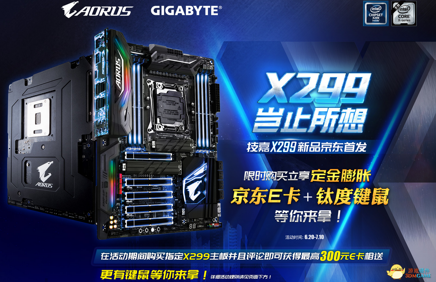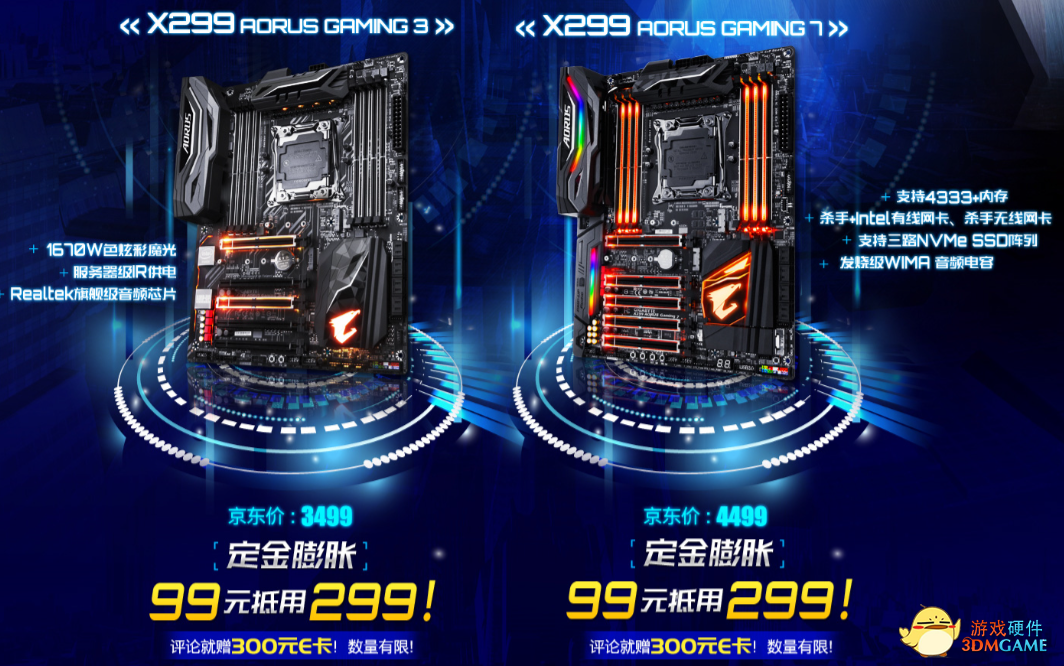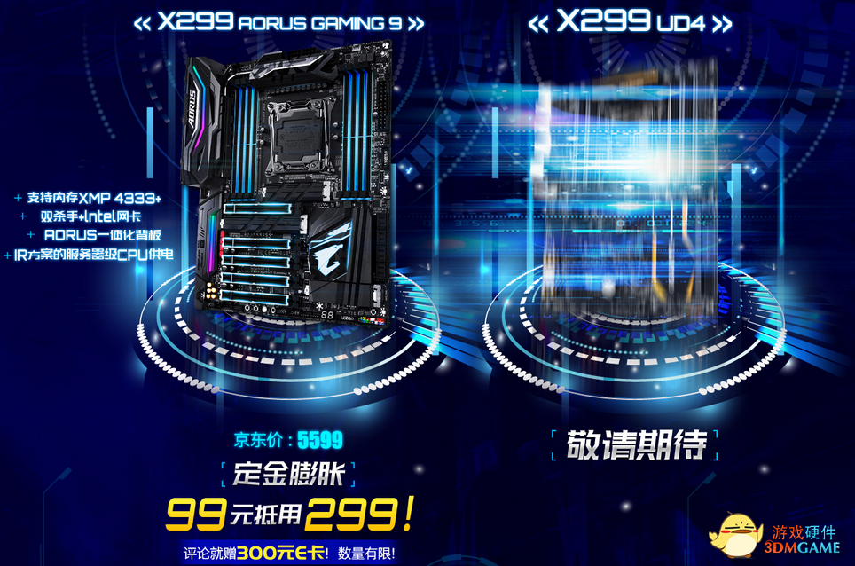 6.20日至7月10日,技嘉京东开启X299新品首发活动,三重好礼相赠给力预售中!。活动期间,购买X299 AORUS Gaming 7、X299 AORUS Gaming 3的各前30名用户以及购买X299 AORUS Gaming 9主板的前20名用户,在7月15日前完成评价晒单均可获赠价值300元京东E卡一份,在评论中还将在其中抽取10条优质评论赠送钛度游戏键盘一个,抽取10条良好评论赠送钛度游戏鼠标一个。此外,在6月20至6月26日期间提前预定X299主板,还可享“定金膨胀”优惠,最高可抵299元!
