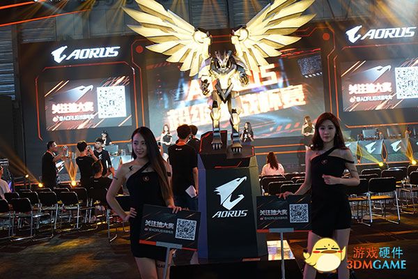 技嘉的场地就在NV爸爸的旁边,这也变相说明了技嘉和NVIDIA的亲密合作关系。远远的我们就看见了技嘉旗下高端品牌AORUS的“雕牌”LOGO!整个场地气势非常恢弘!