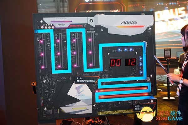在技嘉AORUS展台,有一张以技嘉AORUS Z270X-Gaming 9主板为原型,玩家需要从设定的起点,将电棒安全顺利的达到终点。当然这考验的是玩家的耐心,但想要以更快的速度完成游戏可不是件容易的事。这表现了技嘉主板的流光溢彩!