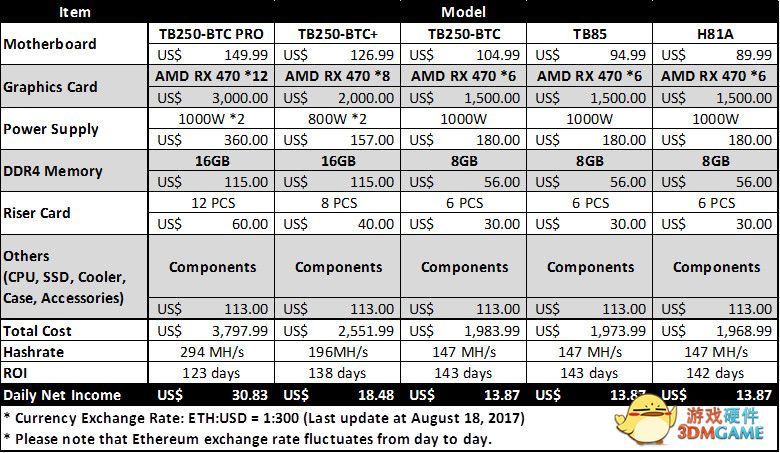 BIOSTAR加密采矿主板支持6-12个显卡,目前可用的型号有:BIOSTAR TB250-BTC PRO,BIOSTAR TB250-BTC +,BIOSTAR TB250-BTC,BIOSTAR TB85和BIOSTAR H81A。无论您是专业人士,主流还是新手采矿,总能找到你需要的!映泰甚至还贴心的贴出了一个成本预算表,让你看到你组建的矿机什么时候可以回本!