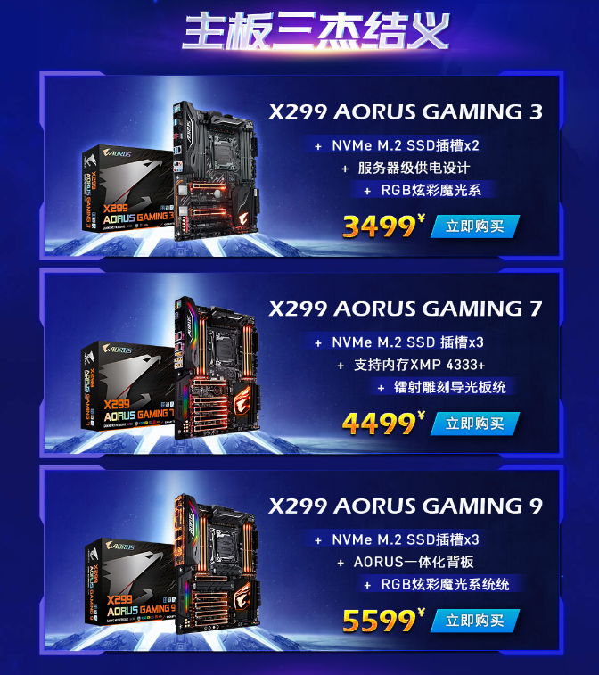 首先展示优惠的是技嘉X299主板,分别有X299 AORUS Gaming 3、X299 AORUS Gaming 7、X299 AORUS Gaming 9,这几款顶级主板在活动期间都展示出了十分优惠的价格,想入手的同学们务必抓紧机会。X299 AORUS Gaming 7作为技嘉X299次旗舰主板,是组建大师级专属电竞PC的不二之选。在外观用料和规格设计上,足以比肩旗舰X299 AORUS Gaming 9主板。这款主板采用全新供电设计与服务器级散热,助力豪取多项超频世界记录,主板插槽均加入合金装甲设计,板载三组M.2插槽支持三路NVMe SSD构建RAID 0,配备前置USB 3.1接口,搭载1600万色炫彩魔光系统,采用Killer专业游戏网卡、Intel千兆网卡和Killer无线网卡三网卡设计。现在购买仅需4499,注册铂金会员还能享受5年质保、专属积分等更多福利。