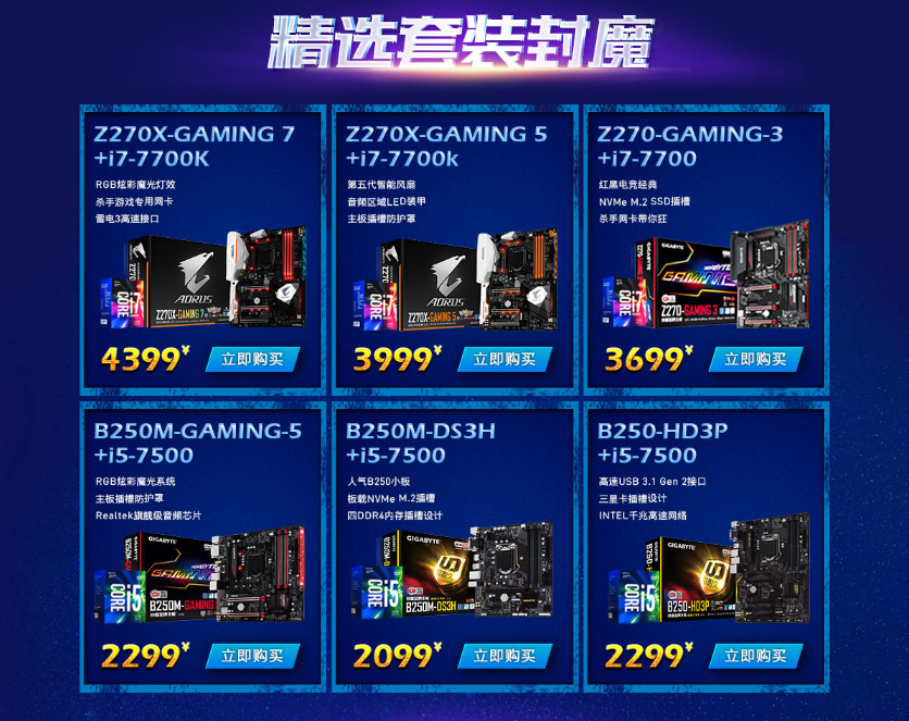 值得各位同学注意的还有板U钜惠套装,不仅有十分优惠的价格,也是纠结症患者的福音,再也不用纠结哪个主板搭配哪个CPU了。技嘉Z270-Gaming 3作为新一代的游戏赛场之星,完美继承了Z170X-Gaming 3的高性价比和游戏属性。在显卡和内存插槽部分均采用了合金装甲设计,板载高速M.2 SSD插槽和USB 3.1高速接口,且支持Intel Optane技术;配备新一代Realtek旗舰级音频芯片,进一步提升了音效体验;采用杀手游戏专用网卡设计,更低延迟赢在起跑线。可搭配i7-7700处理器组建专属影音游戏PC。此外,还有更多板U套装参与活动,玩家可以根据自己的性能需求和预算来选择。