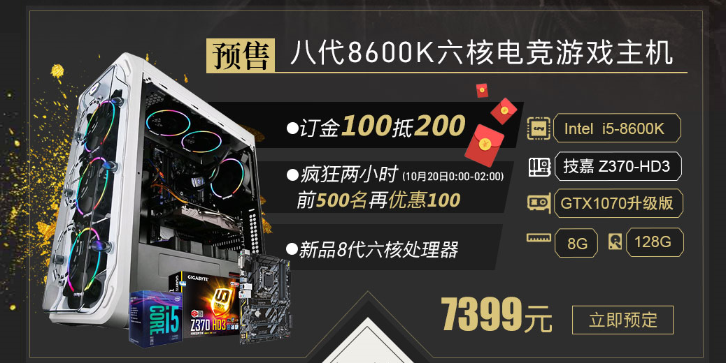在本次活动中,要数值得入手的商品,首当其冲的便属这台八代酷睿六核游戏主机。该主机搭载八代酷睿中端型号i5-8600K、超燃新品Z370-HD3主板及GTX1070显卡,非常适合最近流行的单机和网络游戏。现在1元可购50元优惠券,10月20日0点预付100元定金可抵200元,在20日0点至2点期间前500名付定金者再享100元优惠,预约到手最低价仅需7150元。前100名付尾款者送西数1TB机械硬盘,前101至300名付尾款者送炫光青轴机械键盘,赶紧加入购物车吧。