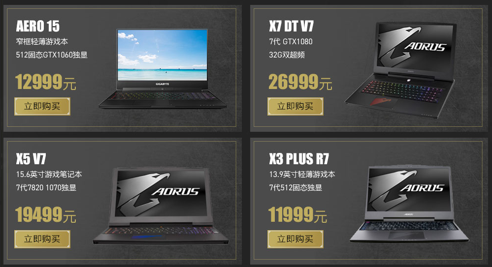 技嘉电竞笔记本凭借轻薄、高性能的特点受到了许多工作党和学生族的青睐,它既能适配出差办公等应用场景,又能满足游戏的要求。技嘉AORUS X7 DT V7作为一款旗舰级产品,流体雕塑质感设计,预装Win10系统,搭载第七代酷睿i7-7820HK处理器及GTX 1080桌面级独显,32G内存,RGB单点全彩背光键盘,广视角防眩光雾面液晶显示屏,运行如飞,性能堪比桌面台式机。而“颜值控”玩家可以考虑Aero15,时尚窄边框设计,颜值和性能等各方面都无可挑剔。