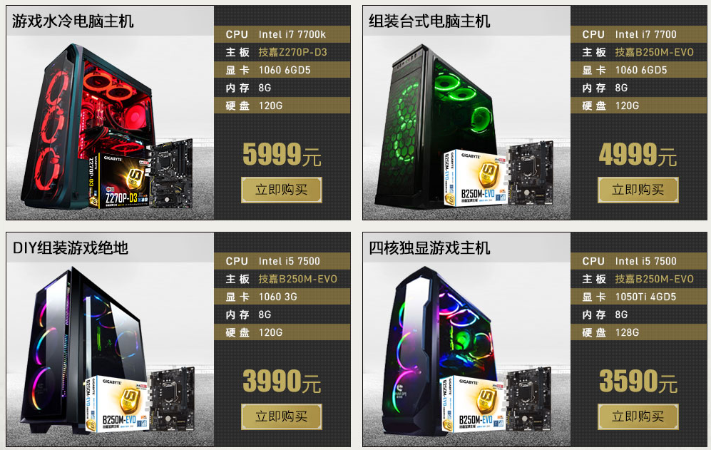 购买整机的好处便是:相较自行DIY来说便宜并省时省力。对于主流玩家来说,“组装台式电脑主机”方案是个不错的选择,搭载技嘉B250小板、GTX1060显卡和i7-7700处理器,能胜任各类主流网游和学习应用,是征战上分的一大好手。此外,为满足不同人群需要,还提供了三款不同价位的办公和游戏配置方案,都拥有极高的性价比。