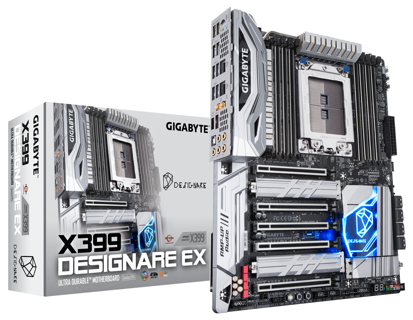 2017年10月23日技嘉科技推出新一代采用AMD X399芯片组的X399 DESIGNARE EX主板。新一代的X399 DESIGNARE EX主板,采用时尚新潮的外观设计,搭配强化背板设计。同时在软硬件方面导入相当多新技术,不但通过NVIDIA®Quadro®显卡及AMD Radeon™ Pro等专业绘图卡的严格测试外,并提供NVMe RAID功能,可以同时支持高达7个NVMe固态硬盘,并加上M.2插槽散热装甲及4-Way多显卡输出、实心电源接头等创新设计,搭配技嘉的炫彩魔光系統、智能风扇等特色技术,让专业设计工作者建构更高质量、更高性能及更有特色的主机。