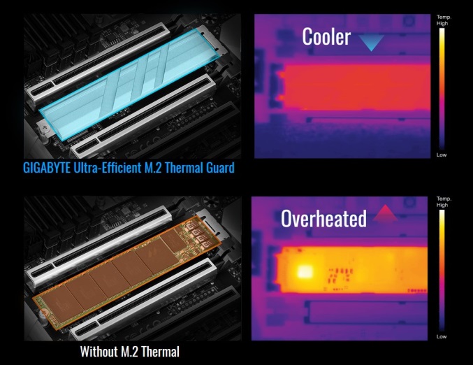 技嘉主板专注于协助专业工作者发挥强劲的储存性能,藉由主板内建三组NVMe PCI-E x4 M.2插槽设计,提供每一个插槽高达32 Gb/s的带宽及传输速度,专业工作者可以获得上佳的储存设备解决方案。同时一般M.2 在运行的过程中可能会因为过热而影响读取速度,技嘉特别研发Thermal Guard散热装甲来帮M.2设备降温,相较于无散热片的M.2插槽设计,技嘉的M.2 Thermal Guard散热装甲可有效降低M.2固态硬盘在高速运行所产生的废热达20℃之多,让M.2固态硬盘能在低温运行的状态下发挥其真正性能,性能狂飙不受限。
