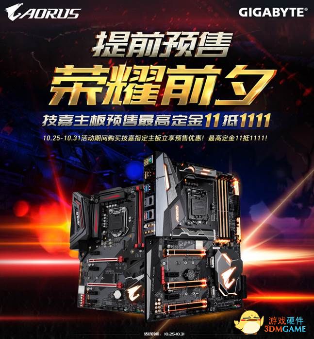精彩双·11,剁手购物节!在这个独特的购物狂欢日里,大家都在忙着买买买。为了让更多的小伙伴能好价买好物,技嘉特意给大家准备了一份省钱秘籍,双•11前夕,技嘉在京东商城将开启提前预售、联合满减和疯狂两小时等多种优惠活动! 10月25日至10月31日期间,在京东购买指定主板即可享受预售优惠,仅需定金11元就能抵1111元,抵扣倍率高达101倍!