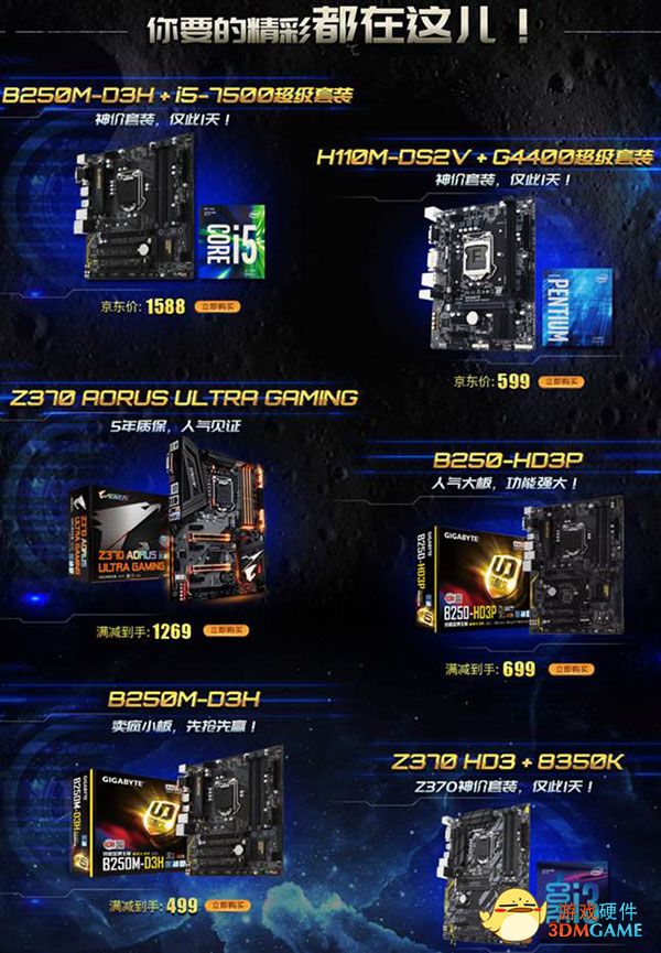 活动主打套装B250M-D3H主板加i5-7500处理器仅需1588元,如此低价只此一天!B250M-D3H主板延续了上一代B150M-D3H的爆款热度。它采用稳定耐用的高品质固态电容,配备支持NVME技术的高速M.2插槽,可使用 Intel Optane内存,并提供Intel千兆网卡,搭配i5-7500处理器可组建高性价比主机,带来四核高性能办公和娱乐体验。预算充足的玩家还可再添置一块技嘉GTX1060独立显卡,即可畅玩目前市面上各式主流的3D游戏大作。