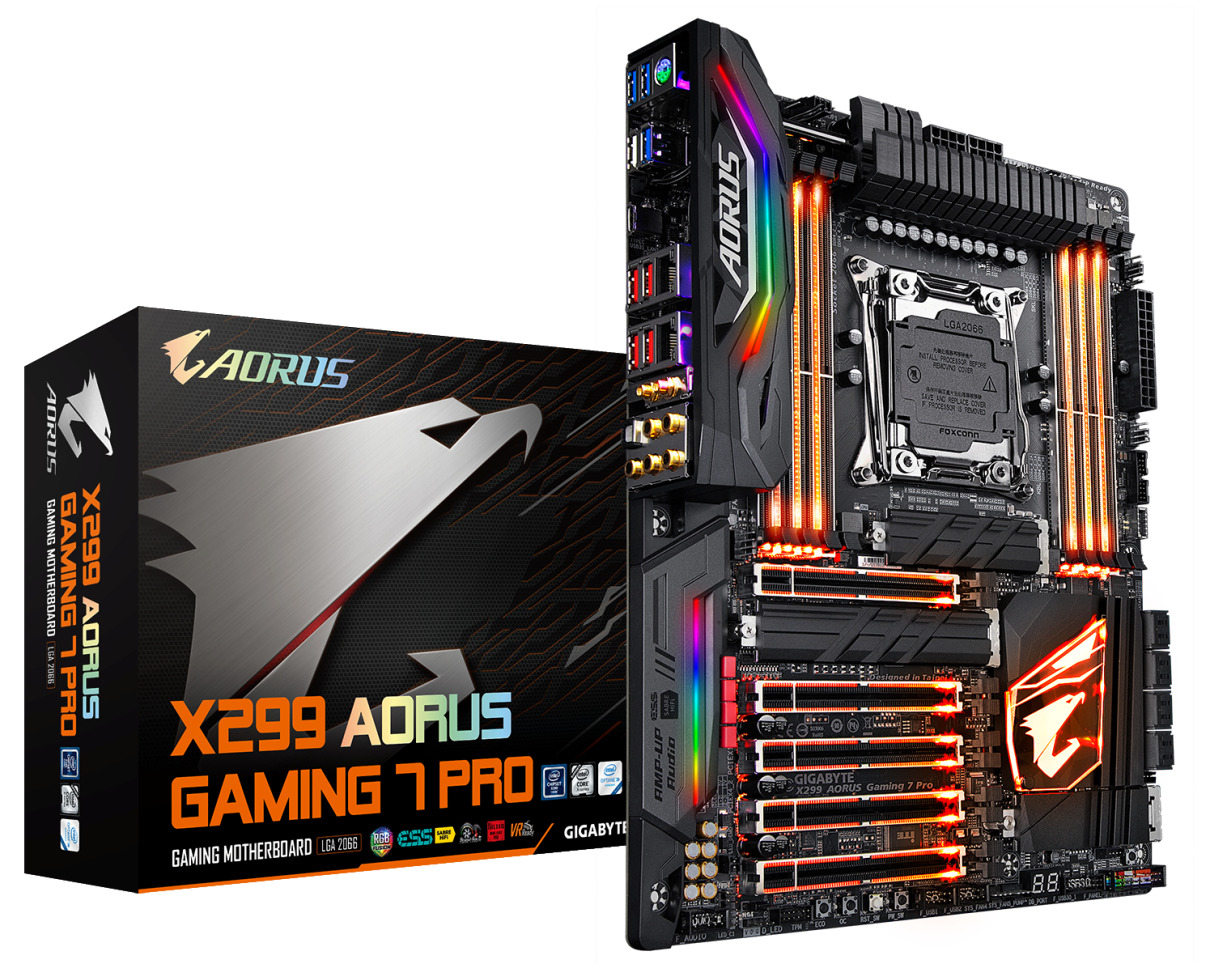 2017年11月22日技嘉科技发表新一代X299 AORUS Gaming 7 Pro主板。技嘉X299 AORUS Gaming 7 Pro主板采用新一代设计的电压调节模块(VRM)搭配超耐久高质量用料,可完美发挥Intel® 新一代18核心Core™ i9 7980XE处理器的强劲性能,除此之外技嘉X299 AORUS Gaming 7 Pro主板搭载可支持300颗数字LED的炫彩魔光系统及可让玩家自行调配散热规划的智能风扇技术等众多技嘉研发的技术及功能,提供消费者优质的保护,让玩家轻松打造理想梦幻电脑平台。