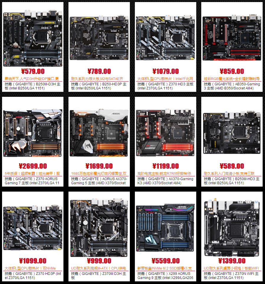 在人气主板区,技嘉准备了12款不同定位的主板以供选择。对于大众玩家而言,Z370 HD3主板是个不错的高性价比之选。这款超耐久系列主板,采用大体积L型CPU散热片、高品质固态电容,做工扎实稳定耐用,Intel千兆网卡、M.2接口等实用接口样样齐全,非常适合组建主流八代酷睿游戏平台。如果你是预算充足的高端硬件发烧友玩家,可以考虑支持Intel最新18核心处理器的X299 AORUS Gaming 9主板;办公以及入门级用户则可以选择B250M-HD3、B250M-D3H等经典4核系列专用主板。值得一提是,技嘉还为喜欢DIY的用户准备一款迷你ITX小型主板Z370N-WIFI,在接口和用料方面规格同样不俗,可用来组建各式高性能迷你小钢炮主机,彰显DIY玩家独特的品味。