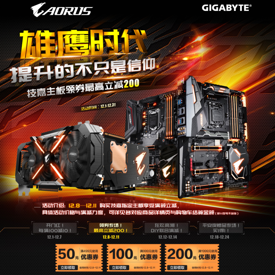 12月8日至11日,技嘉京东“雄鹰时代 提升的不只是信仰”第二波领券优惠活动火热开启。在此期间,活动页面全场商品均大幅降价,还可免费领取满减优惠券,满499元减50元,满999元减100元,满1999元减200元!立戳下方地址,挑选你钟爱的游戏利器,打造专属超凡竞技PC!