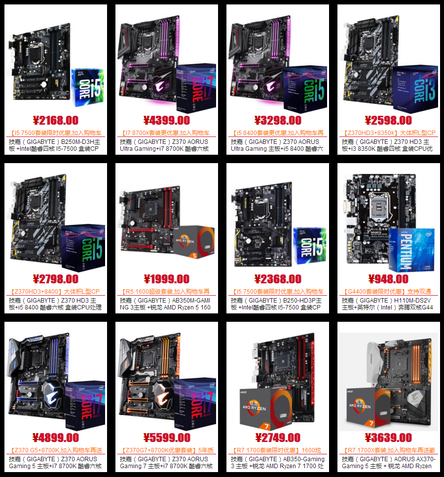 都说好事成双,CPU与主板作为套装购买价格更超值。无论是最新八代酷睿平台还是经典六代酷睿平台,追求性价比或者想要高性能,Intel玩家还是AMD粉丝,都可以在这挑选到最合适自己的套装。对于普通用户而言,B250M-D3H主板和i5-7500处理器是一个不错的选择。B250M-D3H是技嘉超耐久主板中的一员,做工用料扎实,作为百元主板同样配备高品质的魔音音效和良好的网络优化,板载高速M.2接口,支持三联屏高清输出,搭配i5-7500四核CPU,能够胜任玩家大部分日常需求,性价比高强烈推荐。