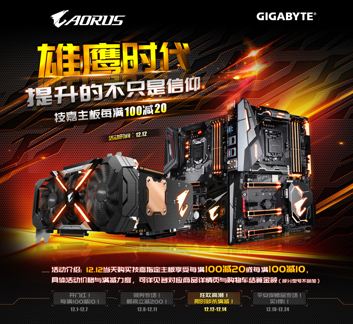 全民狂欢的“双11”余温尚存,激动人心的“双12”又来了!近期想要DIY装机的朋友注意了,12月12日至14日,技嘉京东“雄鹰时代 提升的不只是信仰”第三波重磅活动——“狂欢高潮 限时秒杀满减”火热来袭。届时,购指定商品享满减优惠,每满100元立减20元!在双·12当天,还有技嘉主板限时秒杀活动。立戳下方地址,获取更多活动详情资讯,组建属于你的超神利器!
