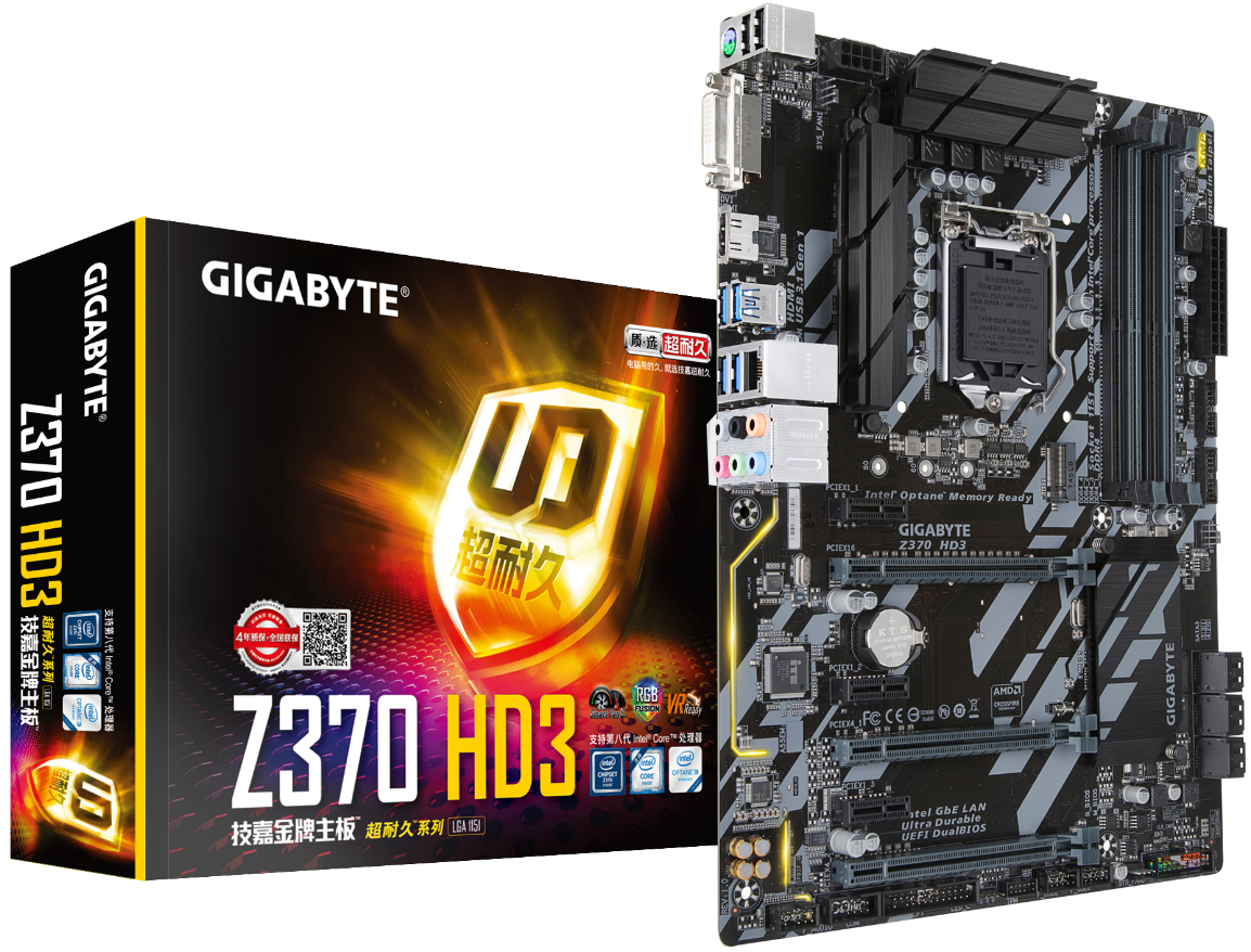 技嘉Z370 HD3超耐久主板支持第8代Intel智能酷睿处理器,支持多显卡互联技术,防静电强化的Intel千兆高速网卡,日系高品质音频专用电容+音频区块降噪LED切割线,高速NVMe M.2 SSD插槽, LED七彩RGB灯带插座,技嘉智能风扇技术,抗硫化元件。该主板通过强化内存供电模块和大量兼容测试,确保主板的内存频率可以支持4000MHz。用户只需要选用支持XMP的内存,在BIOS设置中开启XMP,即可大幅提升内存性能。技嘉Z370系列主板搭配Intel八代智能酷睿CPU最新平台为无数吃鸡玩家带来了极致体验,欢迎广大网吧业主选购。