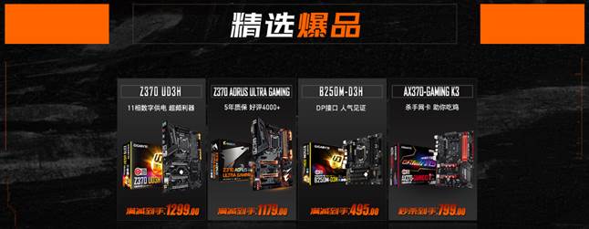 技嘉超频利器Z370 UD3H平日1699元,3.6技嘉盛典限时秒杀价1299元;技嘉口碑之选Z370 AORUS Ultra Gaming平日1499元,3.6技嘉盛典限时秒杀价1179元;技嘉累积3万好评的B250M-D3H平日619元,3.6技嘉盛典限时秒杀价495元;技嘉高阶电竞AX370-Gaming K3平日999元,3.6技嘉盛典限时秒杀价799元!