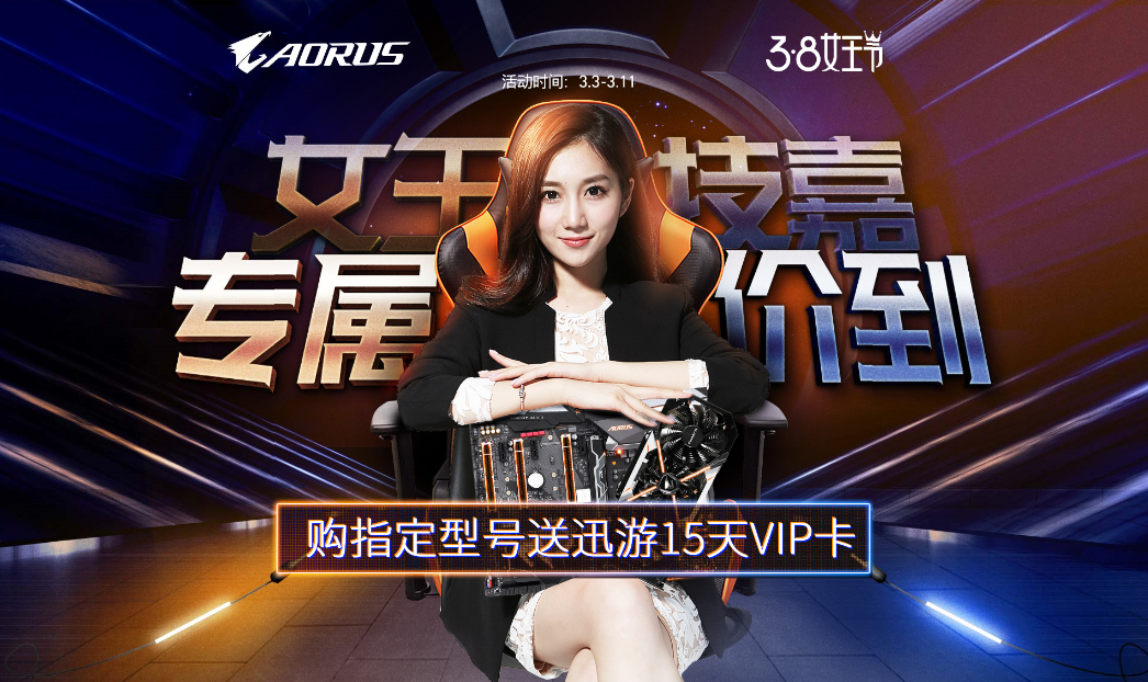 女王降临,专属价到!有道是一台好PC不但能让女王们在工作上效率倍增,在游戏中更可以傲视群雄,3月3日至3月11日各类匠心主板、信仰显卡、贴心套装正在天猫技嘉品牌站等待挑选,购指定型号送15天VIP卡,优惠多多,等你来拿!