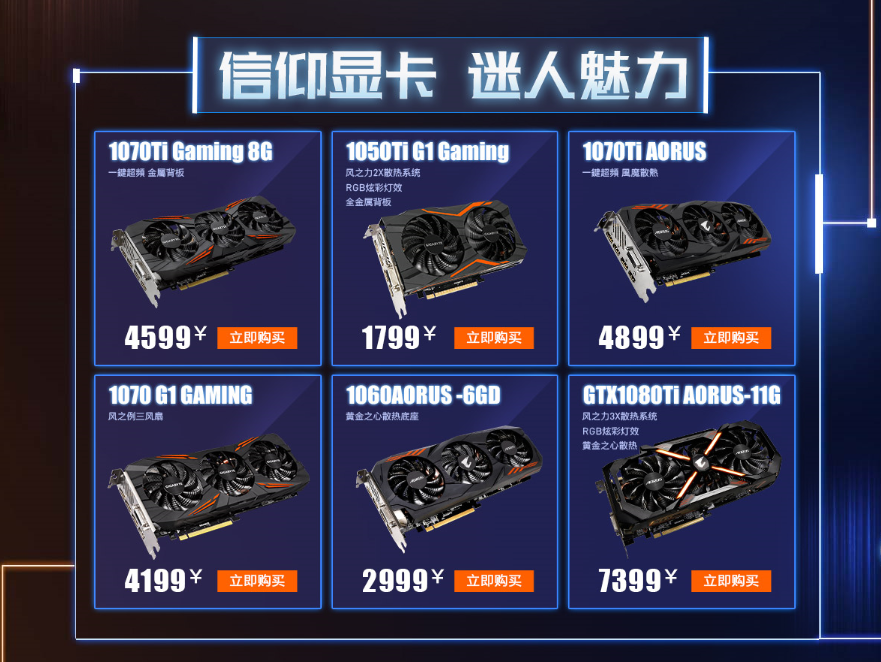技嘉GTX 1060 AORUS-6GD是一款市场热销的甜品级显卡,它拥有6G大容量显存,核心频率为1607-1860MHz,采用技嘉"黄金之心"散热底座,刀刃式扇叶设计,配备RGB炫彩灯效……这款显卡不仅性能出色,散热效果明显且将噪音降至更低,还有酷炫的灯效和外观,非常适合主流游戏玩家。