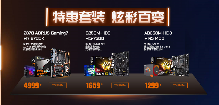 值得各位女王们注意的还有板U钜惠套装,不仅有十分优惠的价格,也是纠结症患者的福音,再也不用纠结哪个主板搭配哪个CPU了。AORUS Z270X-Gaming 7作为Z270芯片组高人气型号,采用加强型11相CPU供电设计,板载Killer专业游戏网卡、Intel千兆网卡双网卡,配备了创新3D音效芯片的魔音音效系统,不仅规格配置给力,拓展性也足够强。在个性定制方面,还搭载了1600万色RGB炫彩魔光系统及可更换式镭射雕刻导光条,轻松实现个性定制体验。搭配i7-8700k处理器,能够应对玩家的绝大部分应用需求。预算稍低的玩家可以考虑B250M-HD3主板+i5-7500处理器套装,无论办公日用还是主流单机都能胜任。