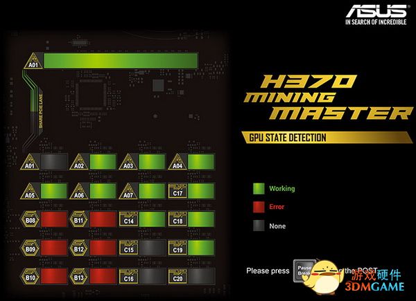 在监测的部份,开机时Mining Master会自动将所有的GPU口扫一遍,在POST界面中显示每张卡片的安全与连接状况。在主机板本身上也有小LED灯让矿工们可以简单看到是否有哪张显卡罢工。主机板上也直接设置了开关和重置键,让你不装机箱也可以控制电脑。此外,Mining Master也和前代一样,设置了三组24-pin电源输入,让你可以随着显卡数量增添电源供应器。