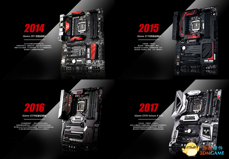 2014年七彩虹推出了第一款iGame系列主板---iGame Z97 烈焰战神X。在获得了巨大的成功后,继续着手着研发与设计,相继推出了Z170、Z270和Z370 iGame系列主板。无论是“全覆盖式金属装甲”的设计,还是电竞联名款“RNG战队定制”的设计,皆获得了广大用户和媒体的好评。