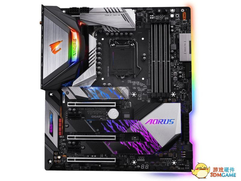 Z390 AORUS XTREME属于“AORUS猎鹰”家族,定位顶旗舰级,用料奢华,拥有大量覆盖装饰,RGB幻彩具有绚丽灯效,边缘还有RGB背光,全部支持自定义,并支持RGB幻彩同步技术。值得一提的是,该板背后还有纳米导热技术背板,尾部I/O也具有RGB背光,而且支持音乐律动和游戏模式,可随游戏战斗场景营造闪烁氛围灯效。