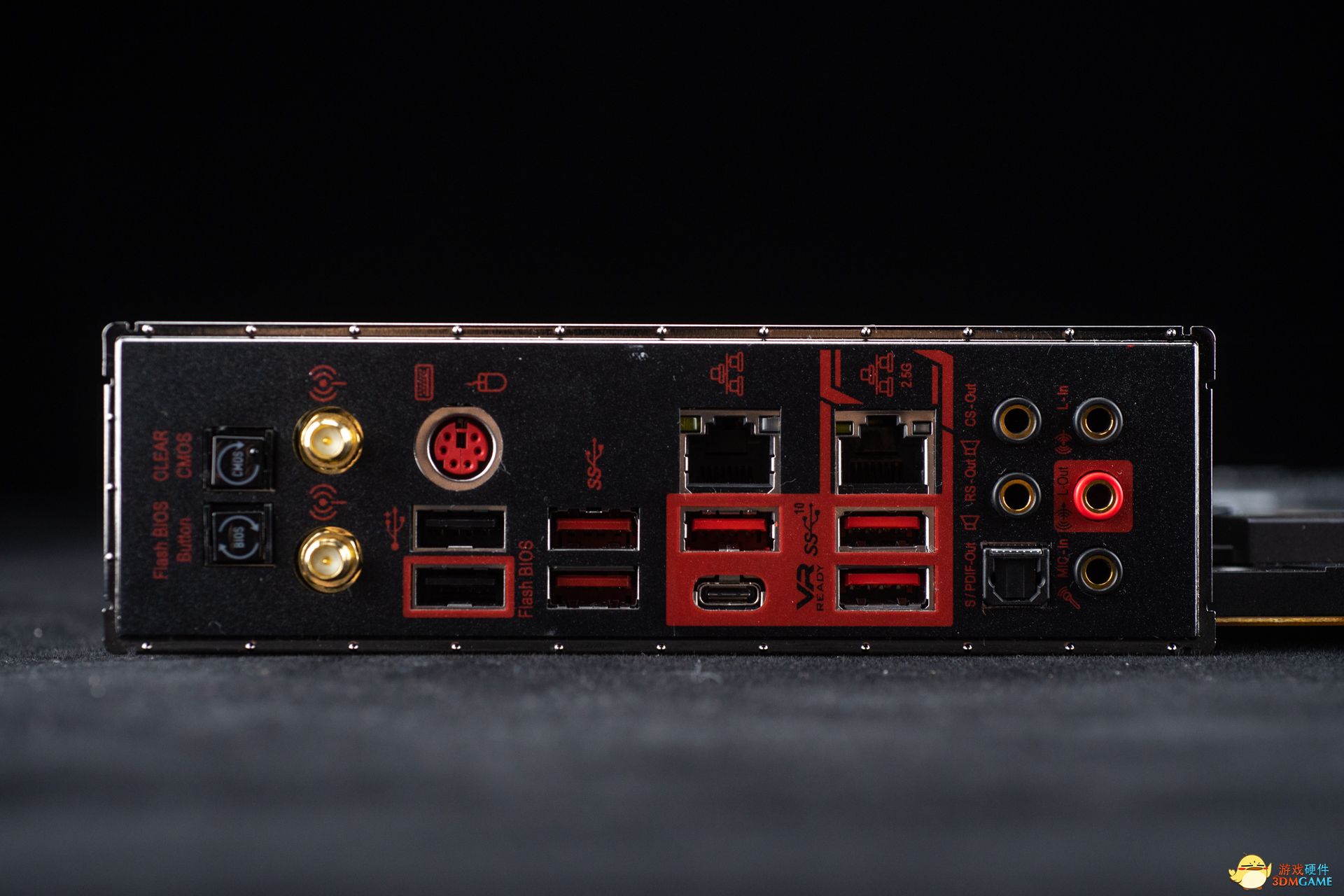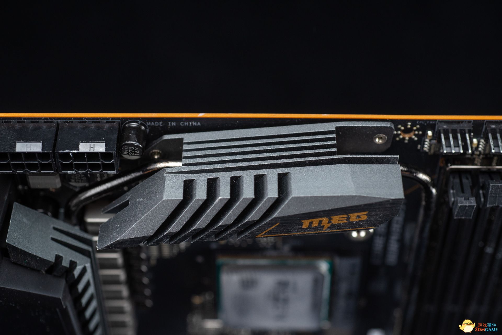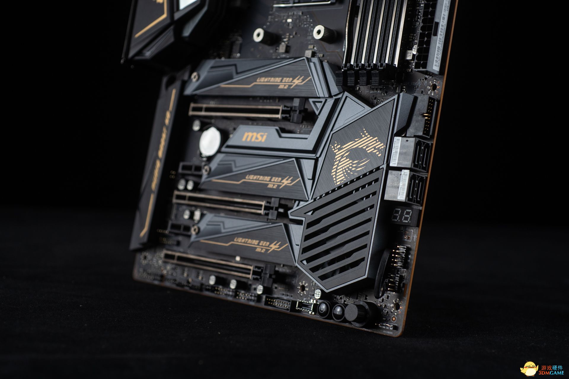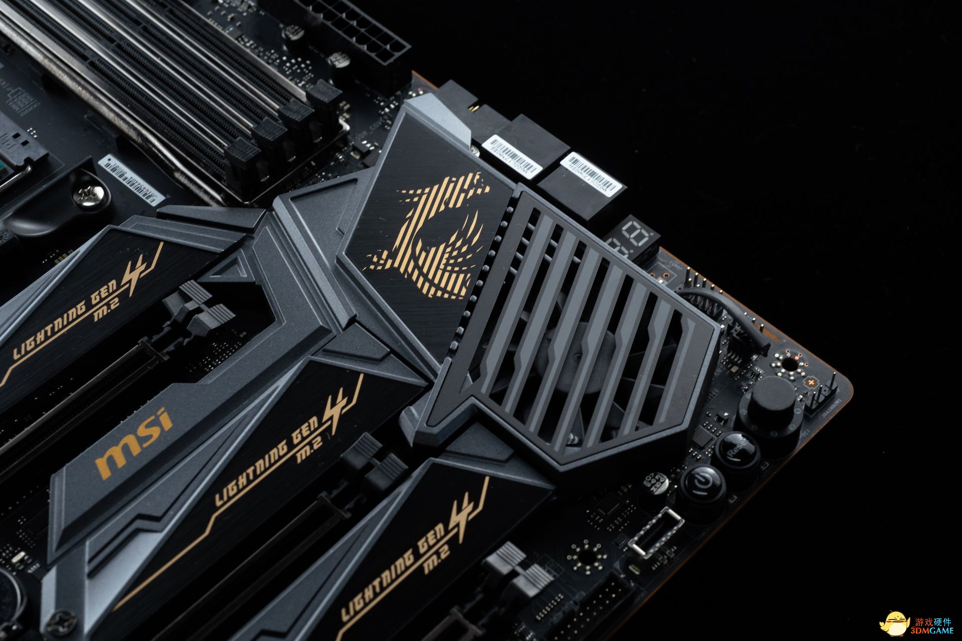 三个M.2散热片以及南桥上方的风扇让主板的下半部分看起来丰满了不少,整体的设计语言更也接近定位顶级的GODLIKE。