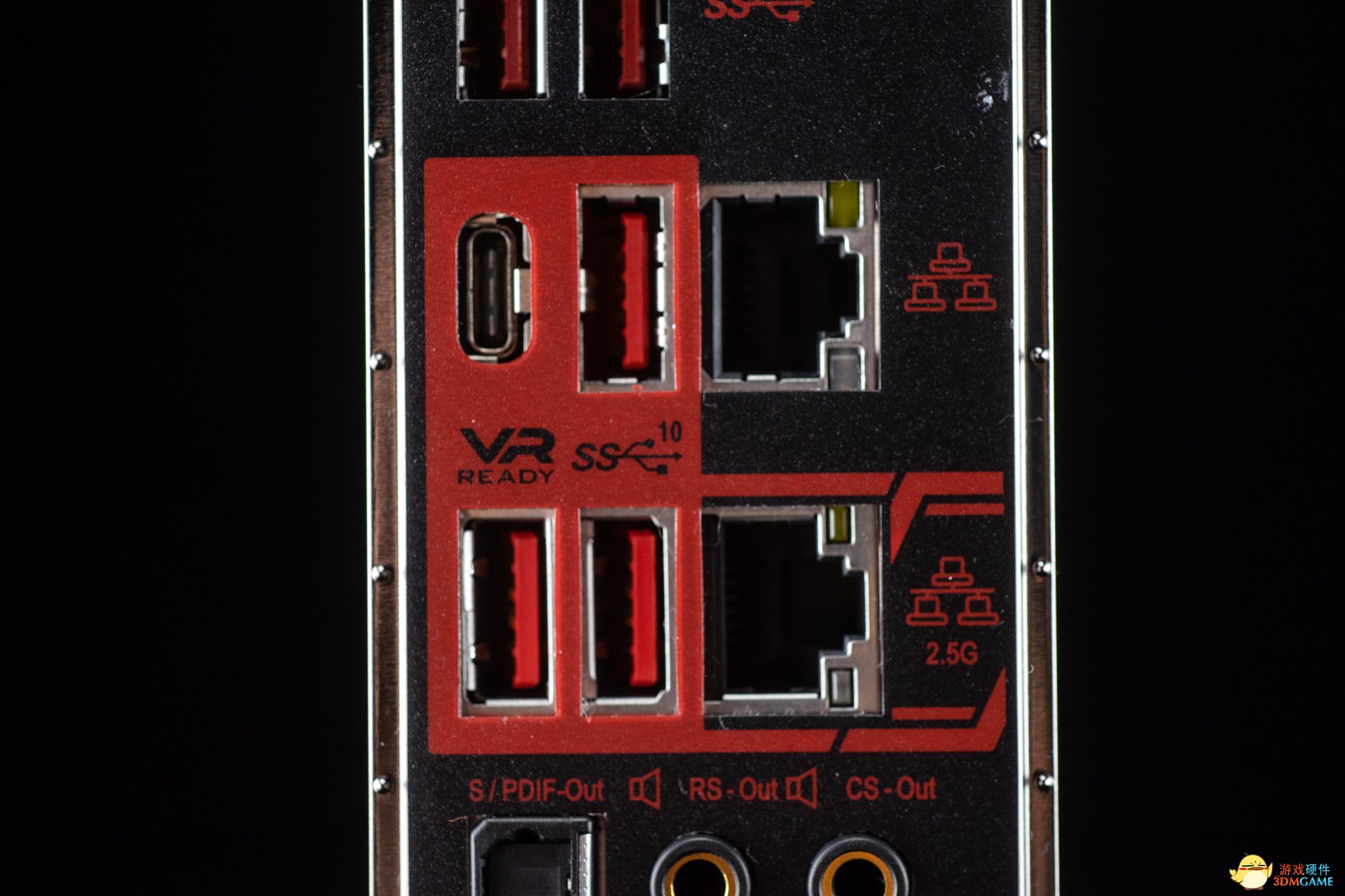 一体式的I/O背板自然是必备,主要接口部分提供了两个USB 2.0、两个USB 3.2 Gen1、以及四个USB 3.2 Gen2,共计8个USB接口,七个为Type-A,一个为Type-C。I/O部分有两个网线接口,上方对应的是使用Intel WGI221AT网卡的千兆接口,下方是对应使用瑞昱RTL8125-CG的2.5G网卡。