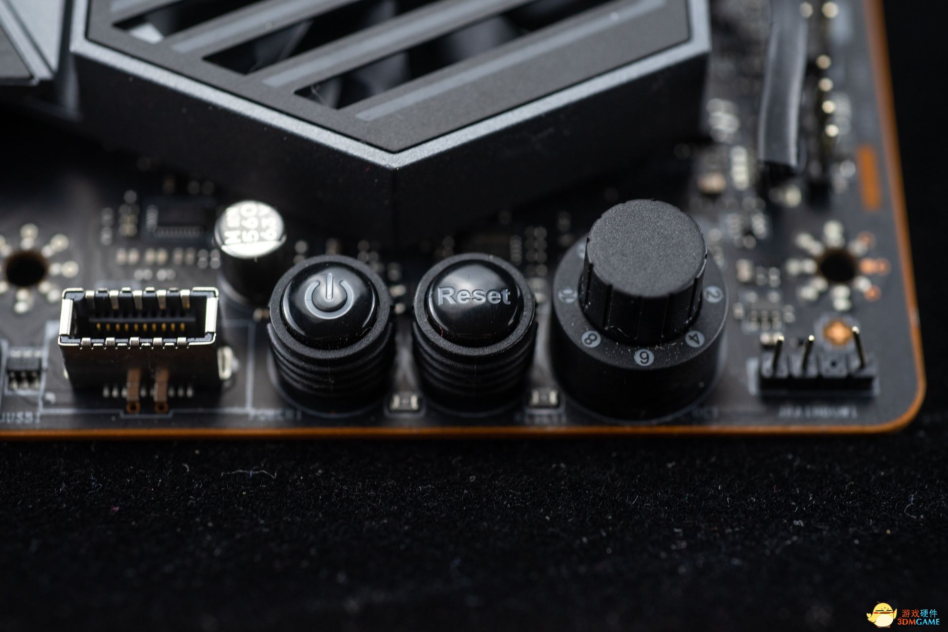 除此之外,最上方还有BIOS更新键以及清空键,主板下方还带有Debug灯,电源和重启键以及有7档预设的一键超频旋钮,这些也都是对那些爱折腾玩家非常友好的设计。