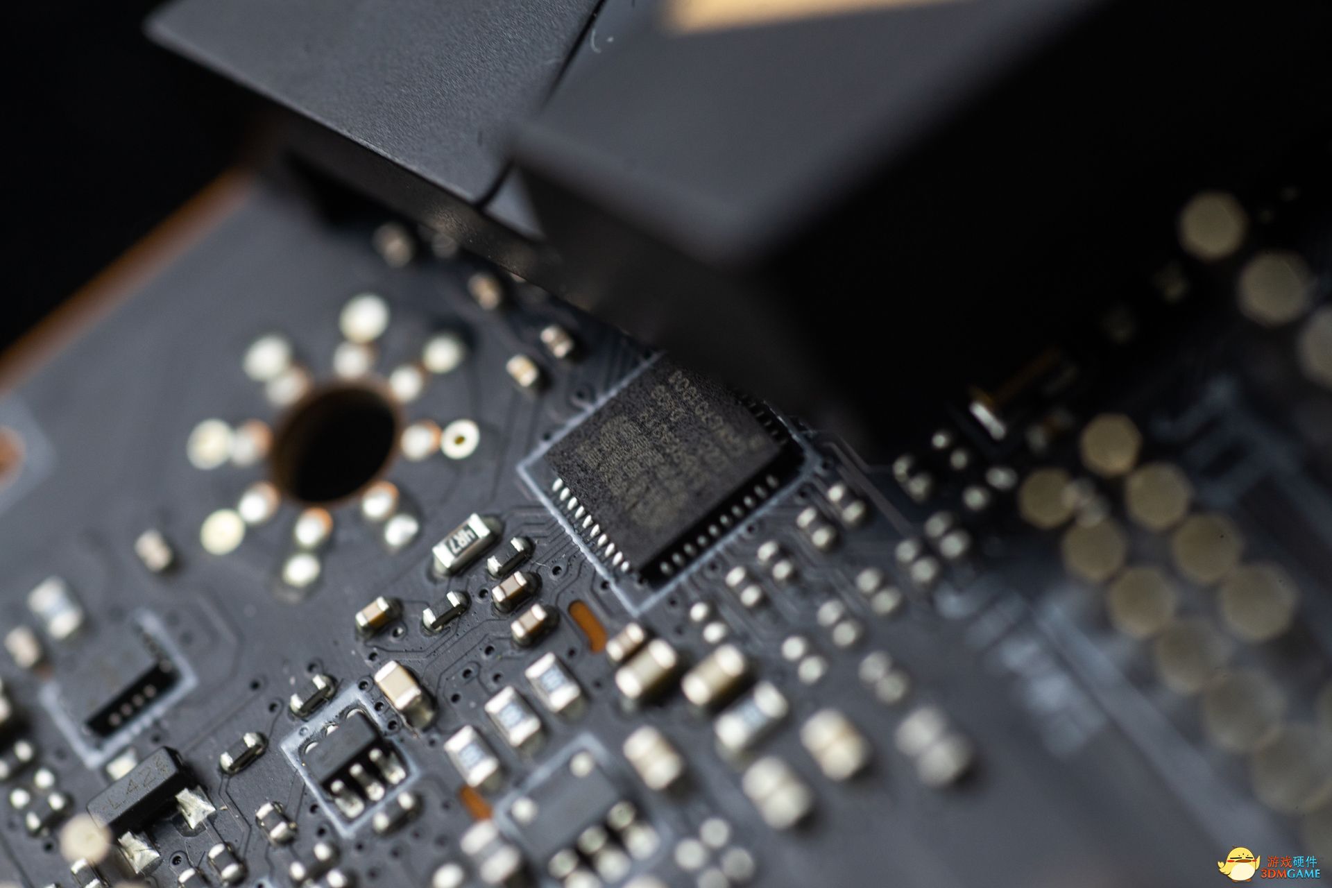 供电部分加装有厚实的散热片,一根热管通过成本非常高的回流焊的工艺从上方的散热片一直贯穿到下方的南桥部分。南桥上方采用的是双滚珠轴承风扇,并且支持自动启停功能,增加风扇的使用寿命。