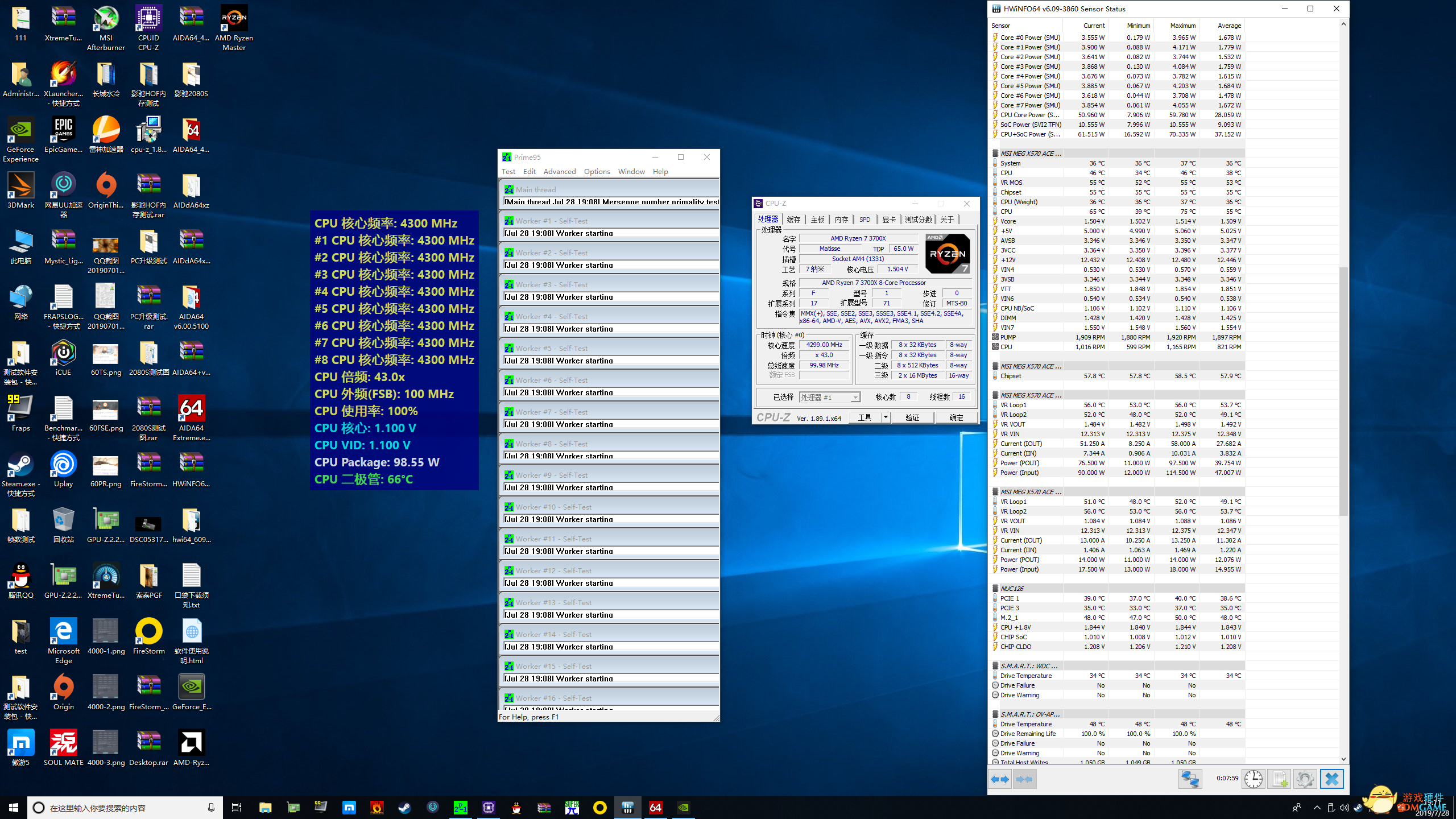 随后我们手动将CPU频率进一步拉高到全核4.3GHz,电压直接给到1.5V,平台一次点亮,并且可以通过拷机测试。在CINEBENCH R15中,多核成绩达到了2218分,已经超过了默频的i9-9900K。