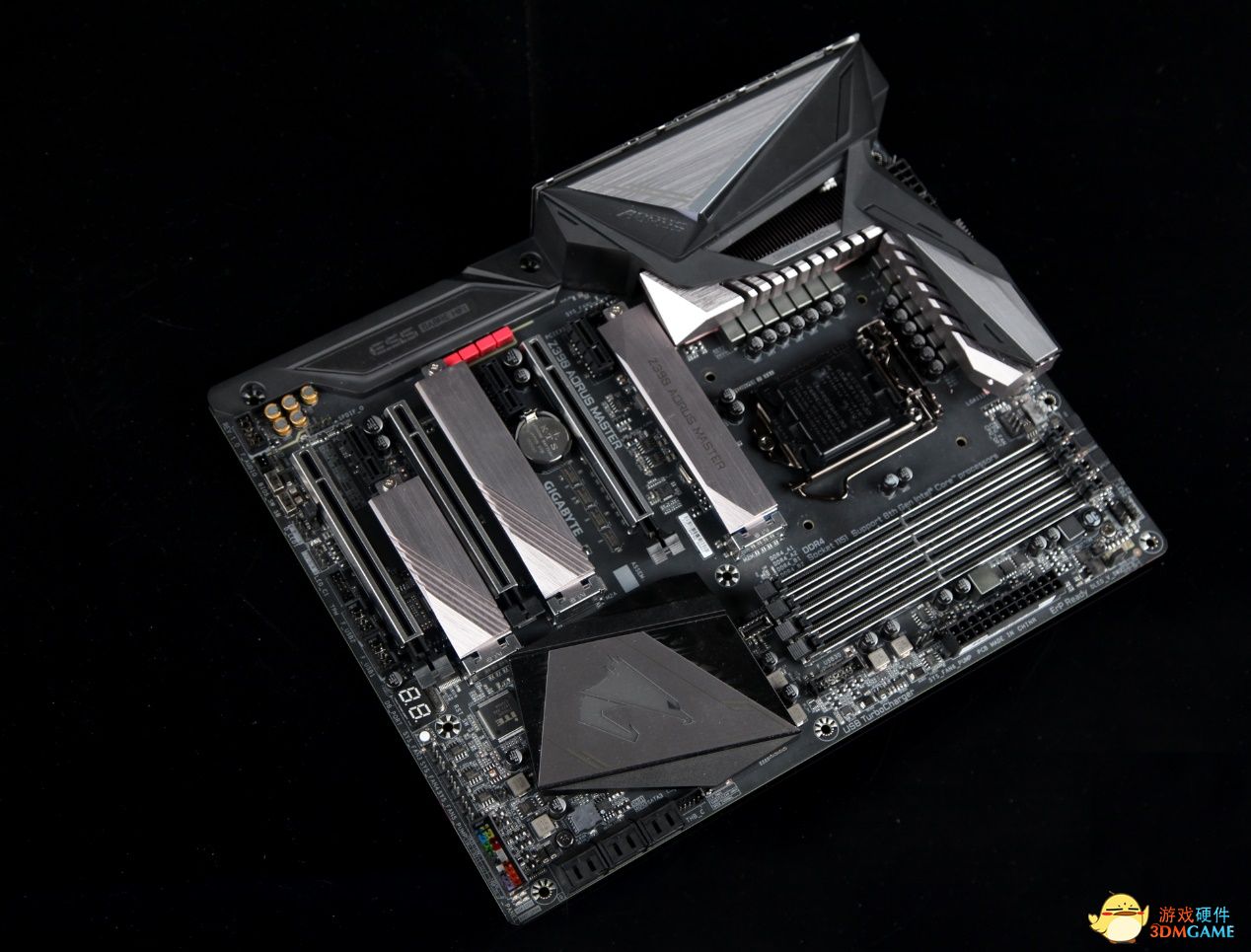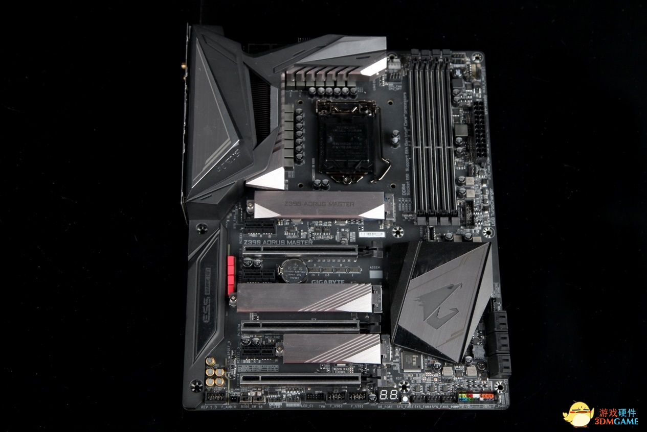 从外观上来看,技嘉Z390 AORUS MASTER时尚的电竞风格让人眼前一亮,装甲覆盖面积相当大,运用到极致的装甲模块可谓武装到了牙齿。主板散热装甲采用黑灰色为基调的主板配色,配合银色的金属拉丝设计质感十足。