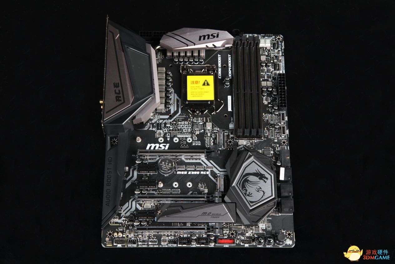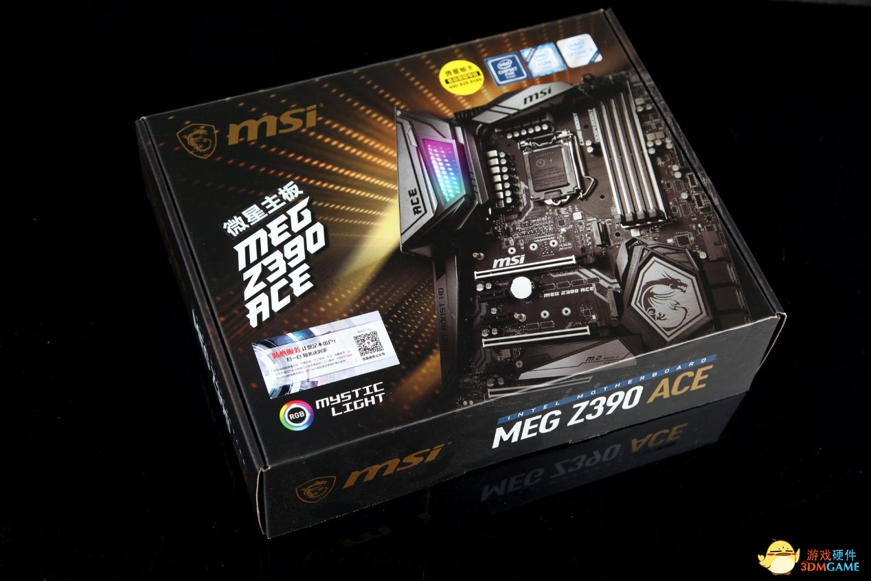 MEG Z390 ACE是一块标准ATX规格的主板,在外观上采用了全新的设计,主板整体采用的是暗黑的风格,MOS散热模块上拥有与Godlike同款新的Mystic Light Infinity RGB(炫光镜)灯光系统,搭配上一套RGB内存使用Mystic Light同步后灯光效果十分亮眼。