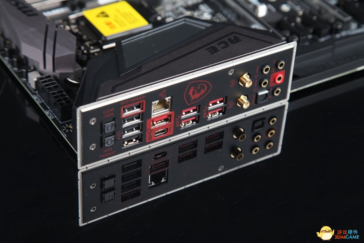 I/O面板接口非常丰富,板载4个常规的USB接口和HDMI接口、2个USB3.0接口、3个USB3.1接口、1个Type-C接口以及5个镀金音频接口,配有CMOS清除按钮、电源按钮和Intel无线网卡。