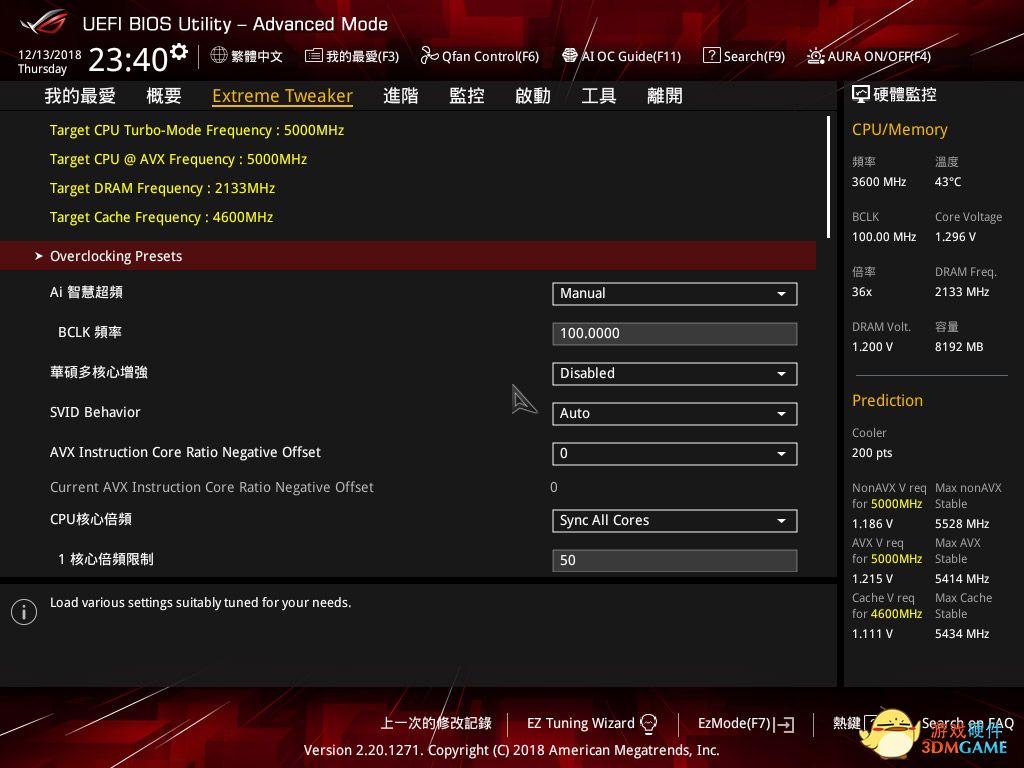 在超频选项中,笔者主要设置的部分就是同步核心频率、调节电压、设定AVX,而这里笔者选择频率5GHz,同时由于本次测试是为了测试主板在机极端条件下的稳定性,所以为了防止调用AVX2指令集时主板自动降低CPU倍频,这里将AVX设置为0,如果各位玩家在家里日常超频使用时,如果非追求跑分的极限超频,日常可以选择设置AVX级别2。