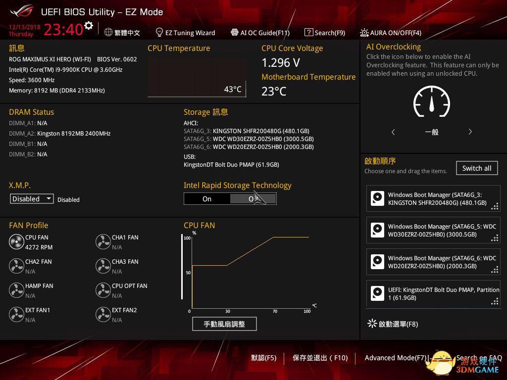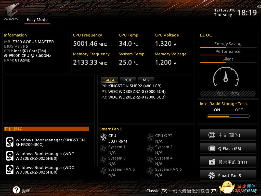 技嘉的图形化BIOS虽然起步晚了一点,但并没有比上面两家少任何功能,在简易界面下,我们也可以直观的看到处理器、内存的情况,也可以通过一键OC控制处理器超频。