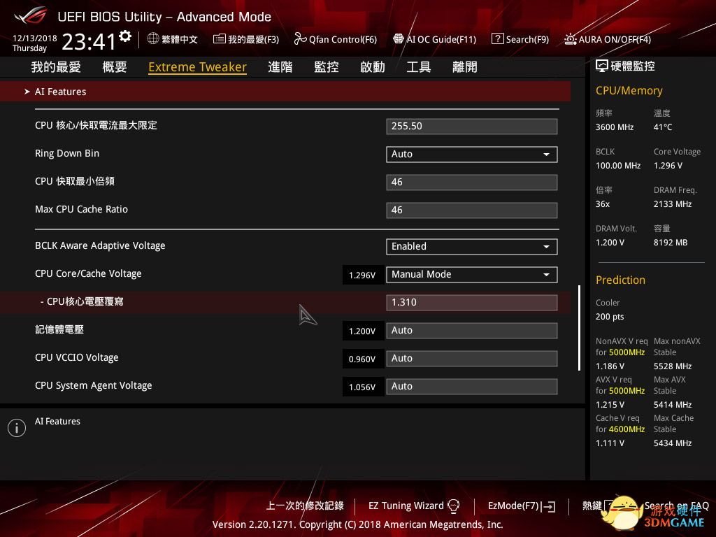 在5GHz的频率下,笔者将缓存频率设置为4.6GHz,电压1.3V,图中的1.31V是截图时的输入错误。