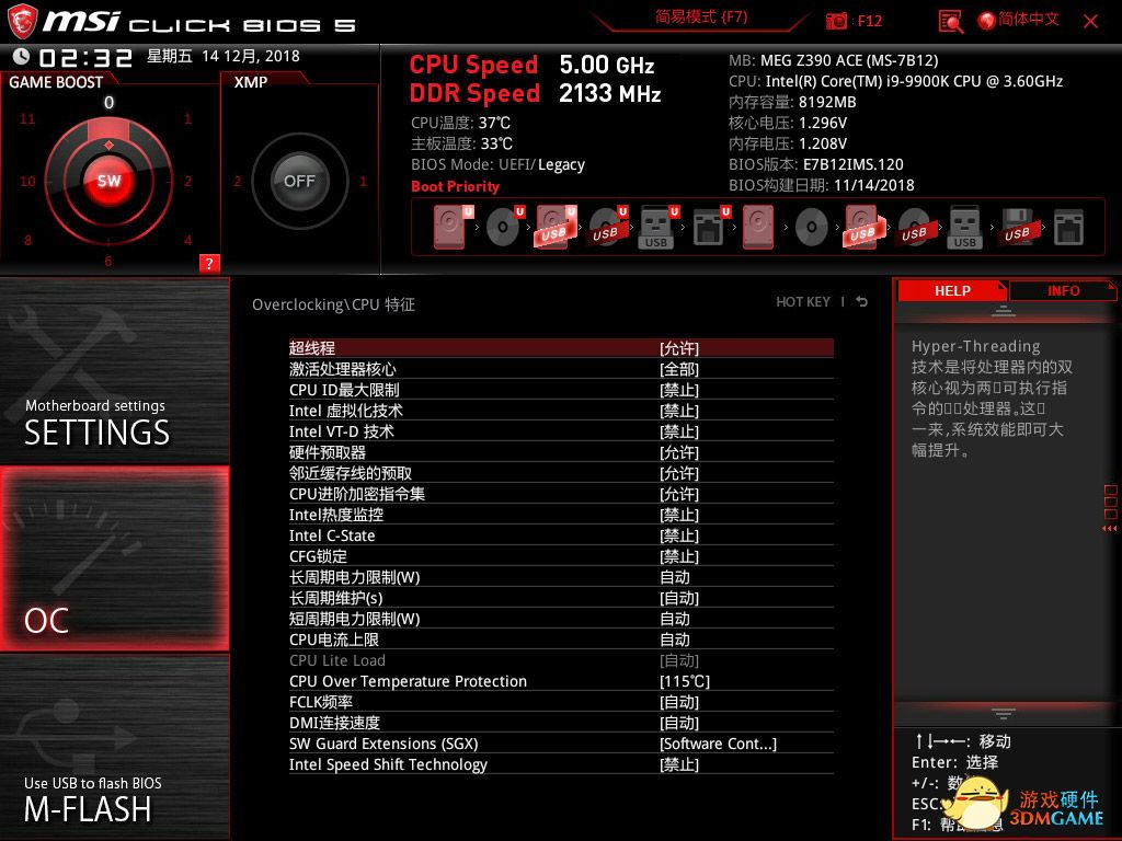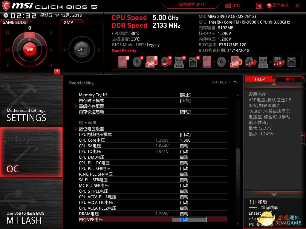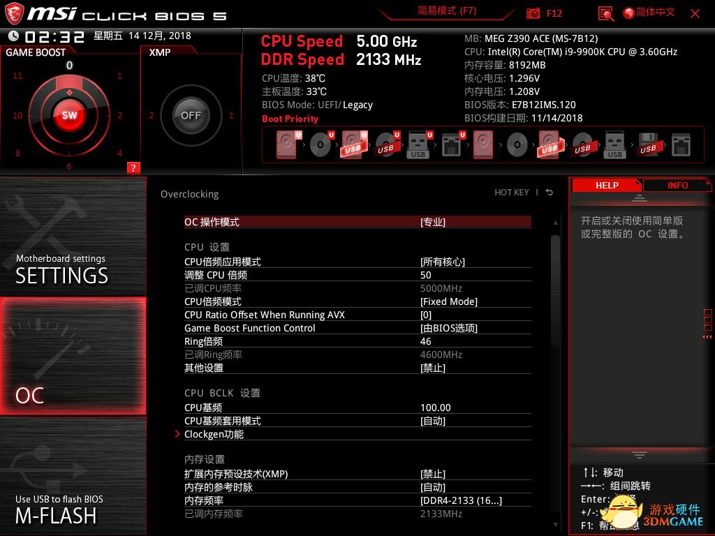 5GHz的超频设置大体相同,处理器核心频率同步5GHz,电压提升到1.3V,其他设置不变。