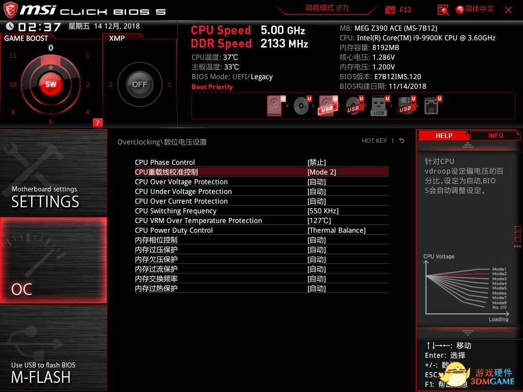 最后打开防掉压,设置为MODE2,并将VRM过热温度提高到最高的127℃。