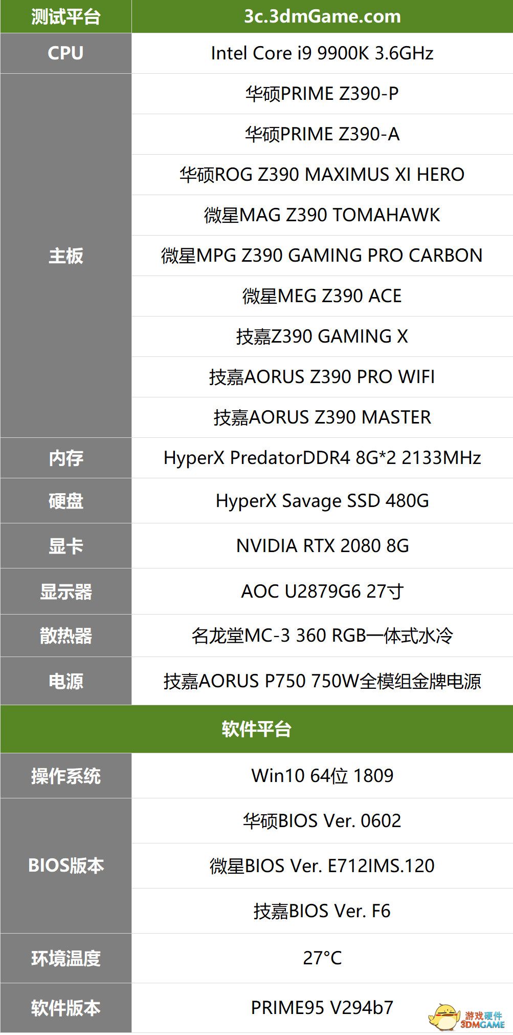 接下来笔者简单介绍一下这一次使用的测试平台,为了测试主板在高频下的稳定性,笔者毫无疑问选择了i9-9900K作为测试处理器,不过由于笔者手里这块i9-9900K是工程样品,也就是各位常说的ES版,其体质及稳定性是否足够出色还有待验证。另外本次测试全部基于裸平台测试,没有将主板真正放入机箱内,同时主板供电模块部分完全凭借主板自身散热设计进行散热,没有人为风扇等其他散热手段干预。测试环境保持不变,室温由空调控制,统一为27℃,保证测试过程没有第三方因素干扰。