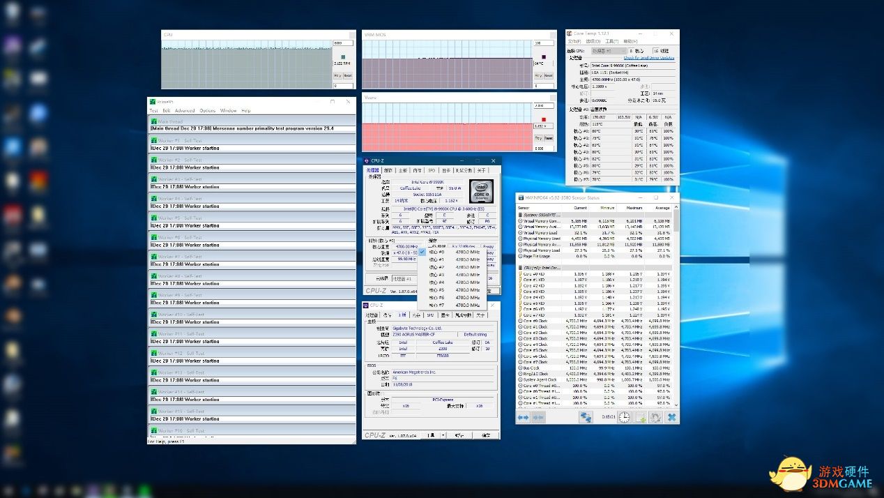 最右侧的是HWINFO系统监控软件,这款软件功能非常强大,可以监控从CPU、内存到GPU的全部传感器参数,我们主要监控的项目为CPU核心电压、CPU散热风扇转速(水冷冷排风扇)以及最关键的主板供电模块温度(VRM温度或MOS温度),这几项的趋势曲线以及实时参数都可以在上方看到。