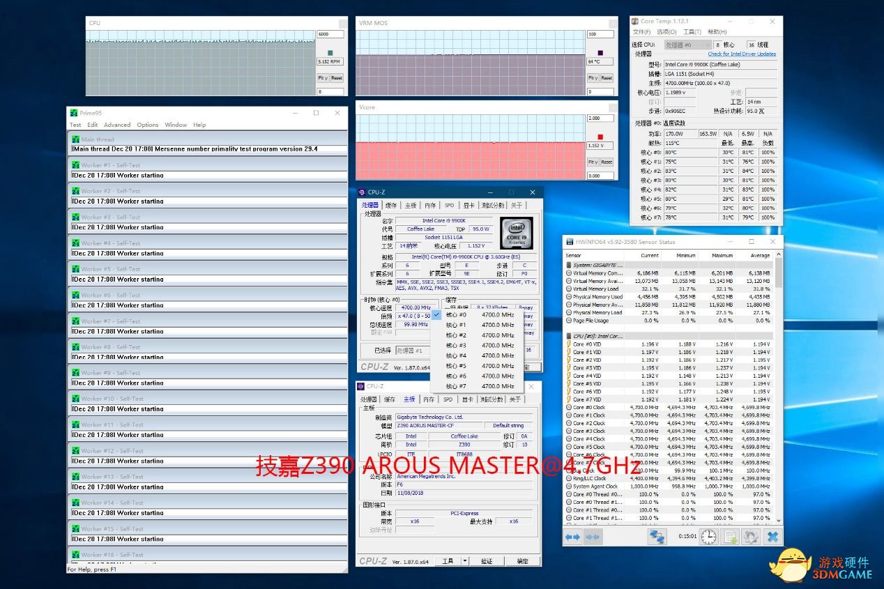 全部介绍完毕之后,我们再来看测试结果,第一块进行测试的主板是技嘉高端系列的Z390 AORUS MASTER主板,在4.7GHz下,烤机15分钟依然稳定,此时CPU核心电压为1.15V,供电模块温度为64℃,CPU最高核心温度为84℃,毫无压力的通过了测试。
