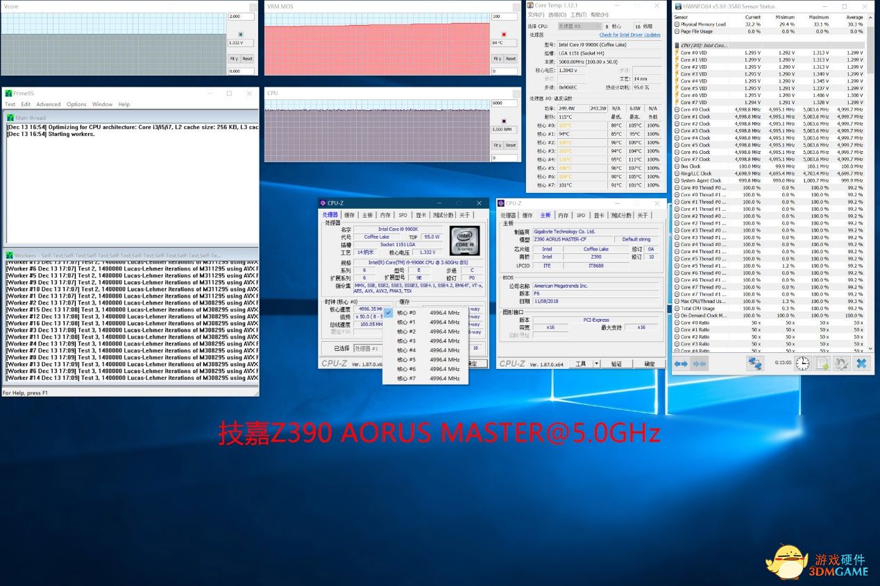在5GHz的频率设定下,Z390 AORUS MASTER将电压推到了1.33V,此时CPU温度已经超过了100℃,CPU最高核心温度达到了111℃,不过还是没有达到笔者设置的115℃上限,因此CPU温度仍然不是这一次测试的瓶颈,而VRM温度在5GHz的频率设定下达到了84℃,看得出全核心5GHz时,测试负载压力非常大,但Z390 AORUS MASTER还是顺利完成了测试。