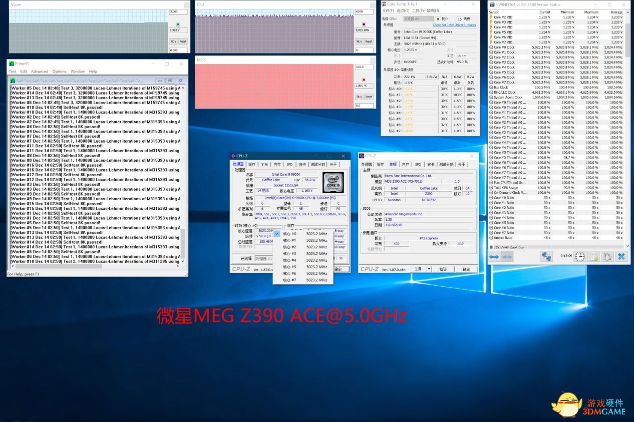 如果各位仔细看前面4.7GHz的数据就能发现,微星主板的外频设定非常奇怪,在设置100MHz外频之后,开机之后在CPU-Z中依然有一定的偏移,而超了外频的结果就是电压需求很高,因此主板将电压推到了1.39V,甚至微星MEG ACE在烤机13分钟-14分钟之间就触发了过热保护断电,而在笔者12分钟最后一次截图时的CPU核心温度已经达到了115℃上限,VRM温度也达到了118℃,因此微星MEG ACE 5GHz烤机也只能以失败告终。