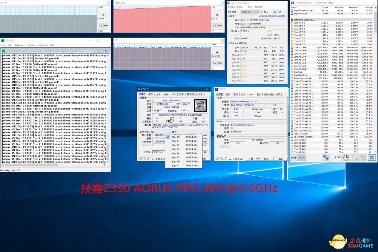 在5GHz的严苛测试下,Z390 AORUS PRO WIFI供电温度也开始快速升高,15分钟后已经达到了100℃,此时核心电压为1.32V,核心温度已经到达了上限的115℃。总体来说虽然供电温度和更高端的Z390 AORUS MASTER相比有一定差距,但也完成了测试。