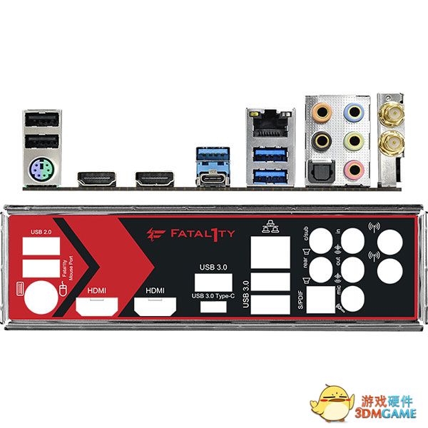 主板背部的输出接口提供了一个PS/2、四个USB3.0、WiFi天线、HDMI(4K@24Hz)、DisplayPort(4K@60Hz)、USB3.1Type-A&Type-C、RJ45、两个USB2.0、一个光纤输出接口和五个音频接口。主板自带的M.2无线网卡用一个金属架子固定在I/O接口后面,型号是Intel8265NGW。